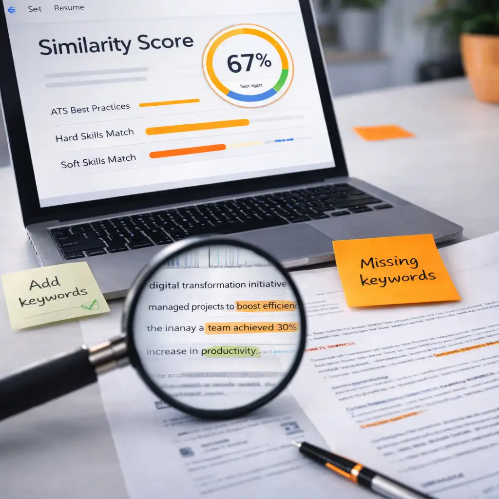 Upload your resume, paste the job description, and watch the scanning magic. Our system quickly compares keywords, role-specific competencies, and hard vs. soft skills to identify where you align or fall short. A live similarity score reveals if you’re hitting the sweet spot or need quick tweaks.